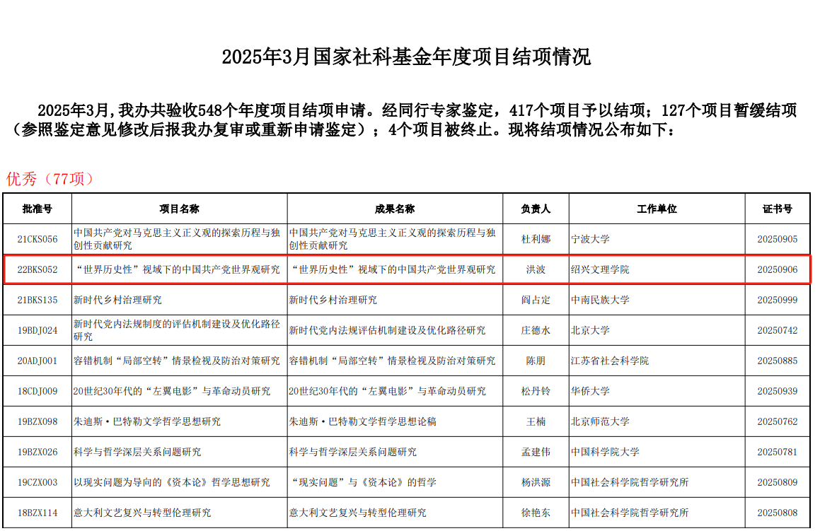 4月1日,全国哲学社会科学工作办公室公布了2025年3月国家社科基金年度项目、青年项目和西部项目结项情况。今年共有417项予以结项,77项评定为优秀。其中,伟德官网洪波教授荣获国家社科结项优秀!