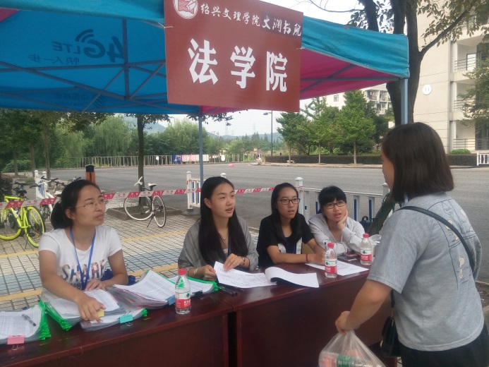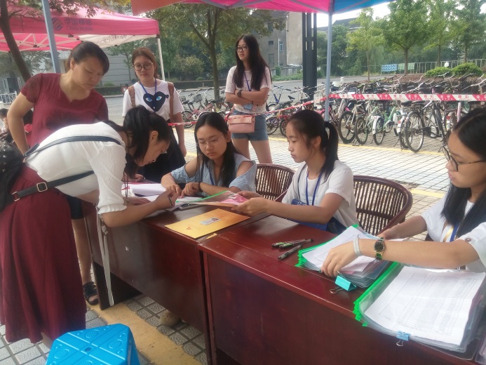 文澜书院门口高挂起了迎接2015级新生的红色迎新横幅。除往年的工作人员安排外,提早报到的新生也积极主动参与到迎新工作中来。在迎新现场,工作人员积极地帮助新生和家长解决遇到的各类问题,主动地引导,细致核对入学材料相关信息。