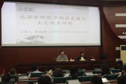 李教授的讲座从“毛泽东研究中的历史虚无主义观点”的界定切入,指出其显著特征是“以学术研究为形式,以实证史学相标榜”。他从分析历史细节是否真实、真实的历史细节必须历史的看待、历史细节的真实性不等于历史本身的真实性、要正确的把握历史的本质和评价毛泽东的历史工作、研究毛泽东应该持什么样的价值立场等五个方面对毛泽东研究中的历史虚无主义观点进行评析。他提出要科学的理解和看待党的历史,要批判历史虚无主义观点,坚持和维护中国特色社会主义,注重对当代大学生世界观、人生观和价值观的培养。他强调要在学术研究中批判虚无主义观点,强调应当站在中华民族、人民的立场上,来客观全面公正的看待毛泽东和党的辉煌历史。