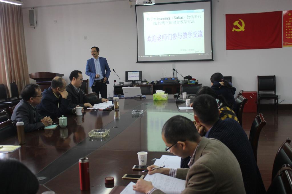 老师给全体教师作了一场“基于e-learning(Sakai)教学平台的线上/线下混合教学方法”的培训辅导报告。