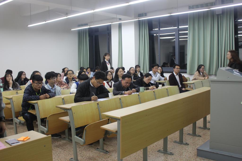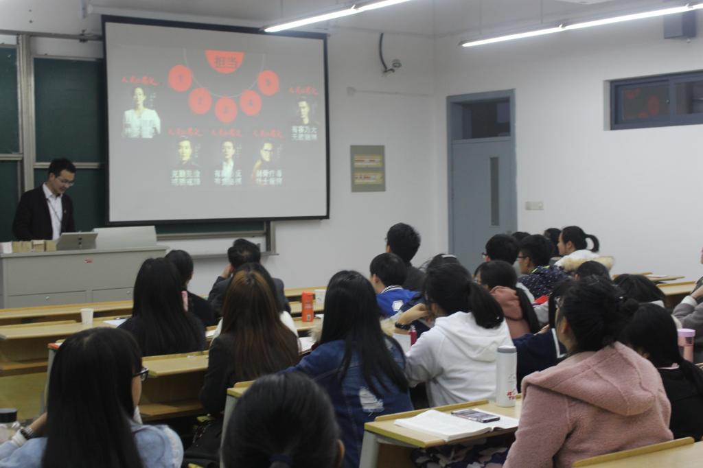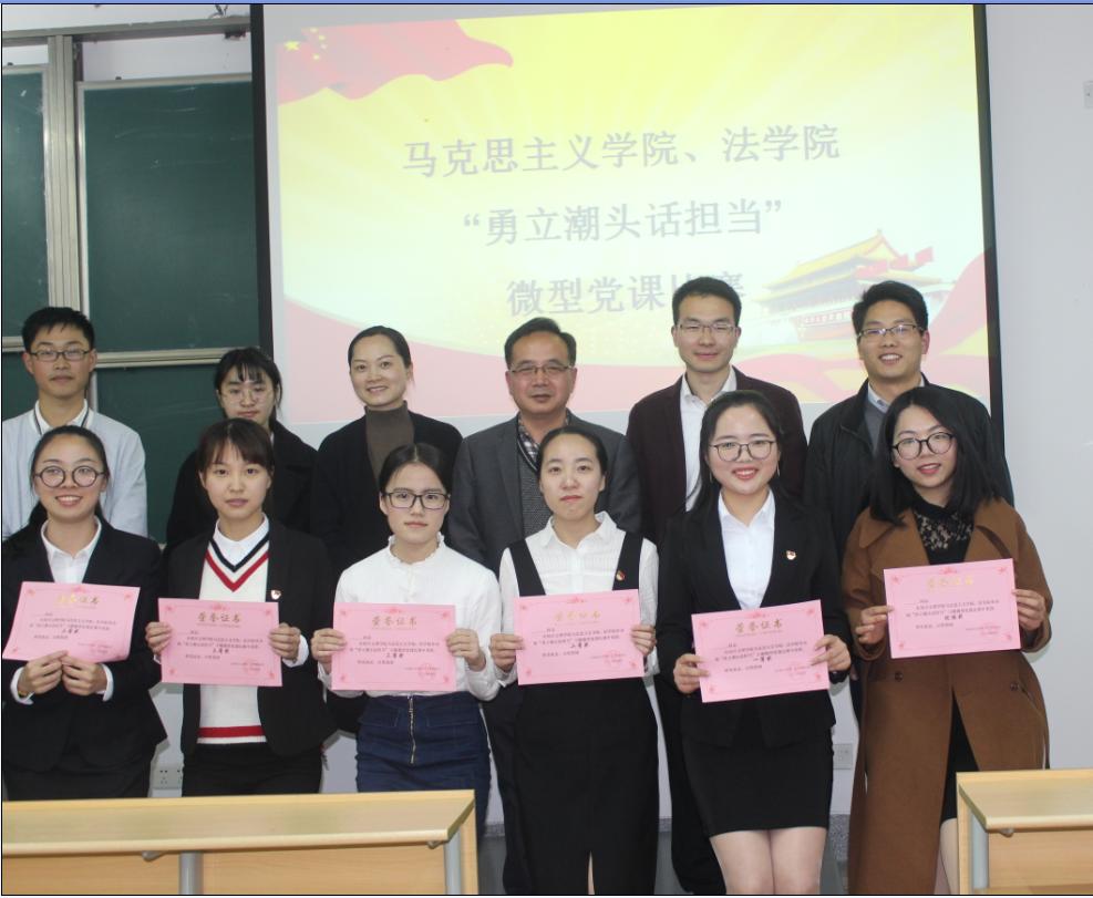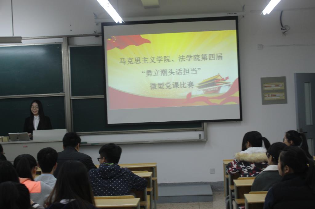 6:30,在南山12号楼313教室开展了学院第四届“勇立潮头话担当”微型党课比赛。到场的评委有学院党总支书记陈林刚,党总支副书记钱晓萍,组织员裘波。经初赛筛选后,共有9位学生党员进入本次比赛。全院党员、部分入党积极分子代表参加了比赛观摩。