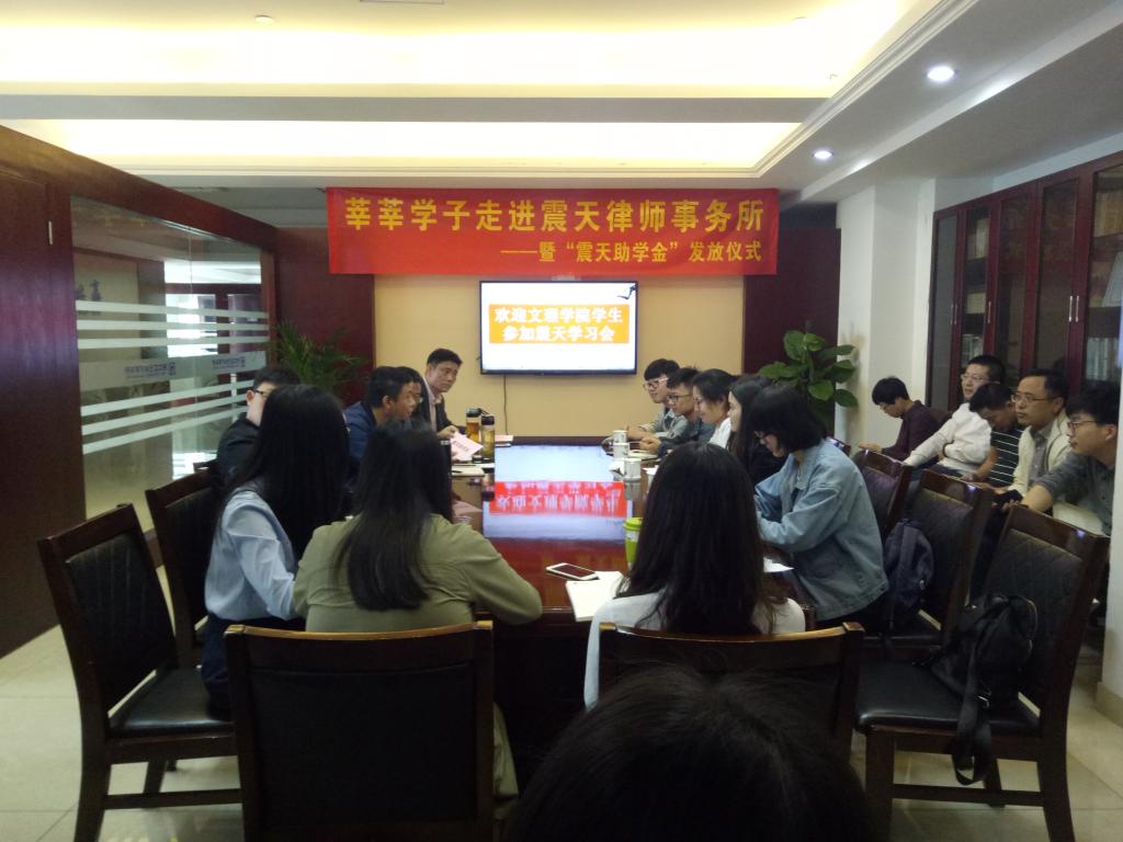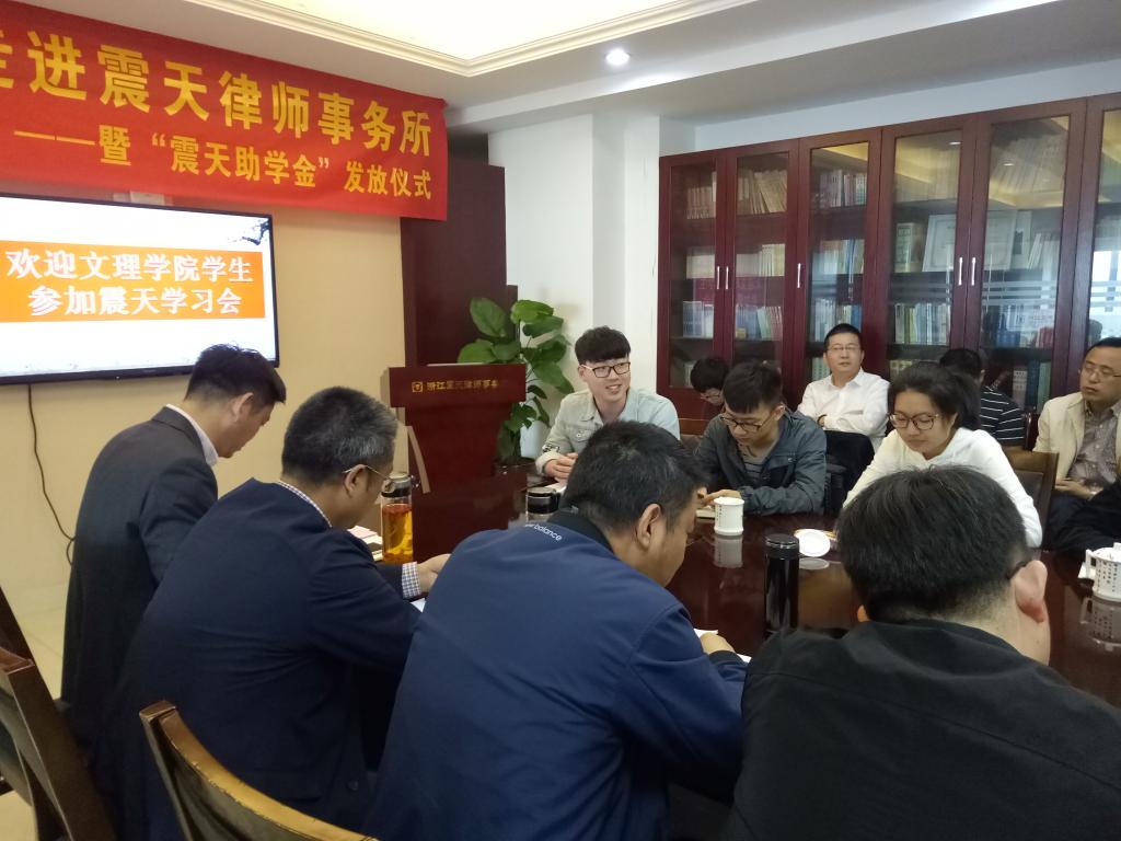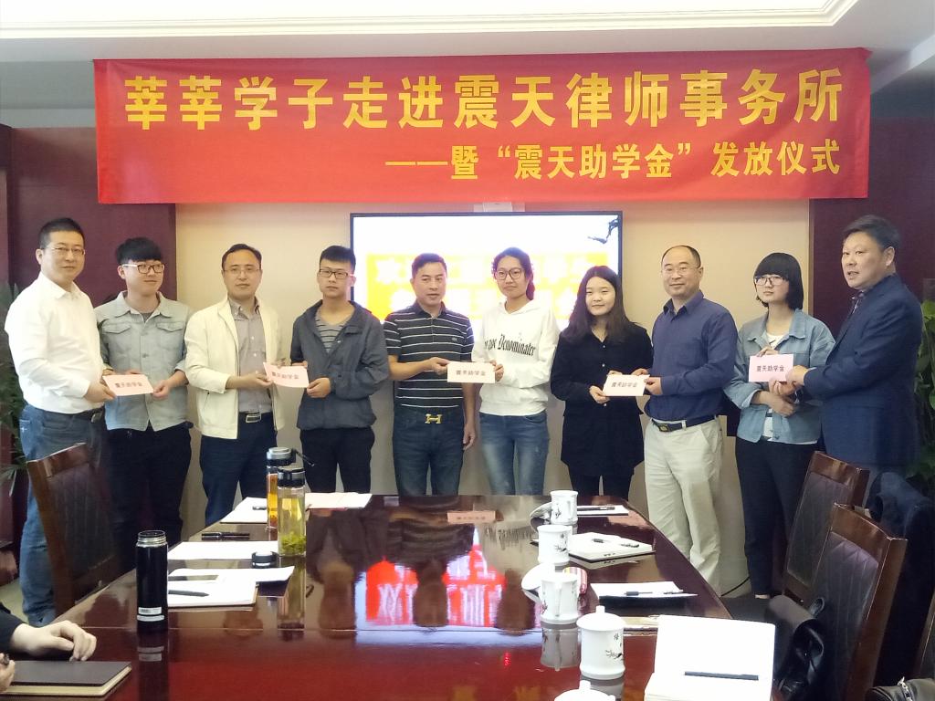 上午,2017年“震天助学金”发放仪式在浙江震天律师事务所会议室隆重举行。震天律师事务所周利生主任携该所律师代表及伟德官网5位受资助学生出席发放仪式。
