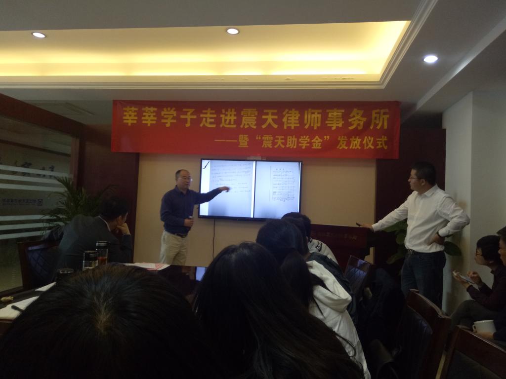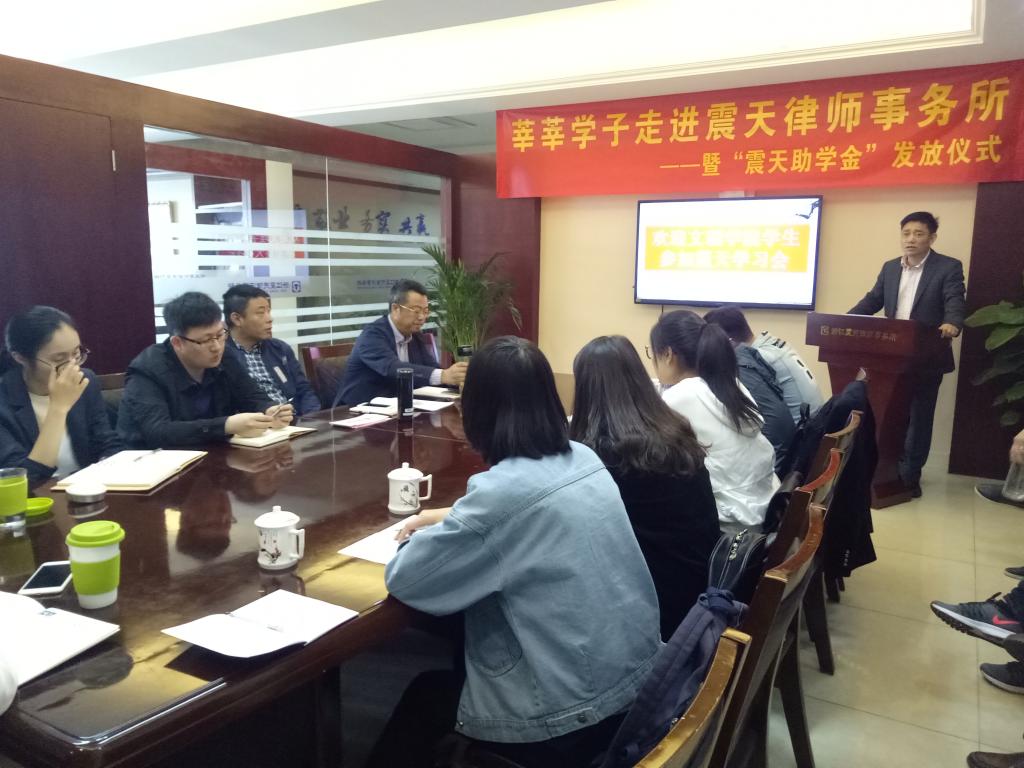 发放仪式开始前,伟德官网学生在事务所人员的热情招待下参观了事务所的办公环境与软硬设施。震天律所周利生主任向大家详细地讲述了“震天助学金”的历史由来以及事务所发展历程和取得的优异成绩,同时周主任对同学们也表达了深切的关心与期望,希望大家能够以新生般的势头,努力学习,在将来成为出色的法律工作者。