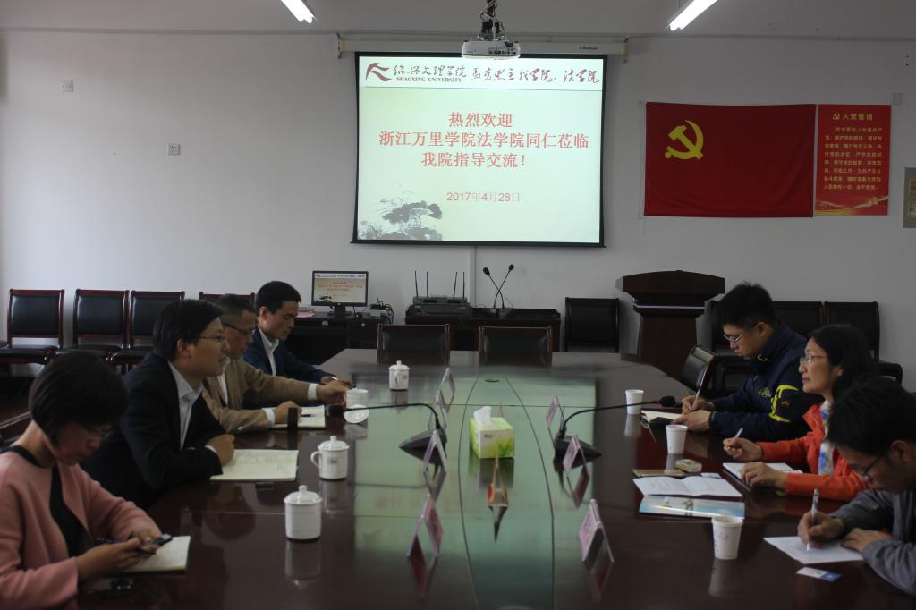 下午,浙江万里学院法学院余妙宏副院长率该院法学专业负责人、学生事务发展中心一行4人来伟德官网考察交流。法学院副院长喻文莉,法学专业书记,行政职能部门教师代表参加交流。座谈会在学院四楼会议室举行。