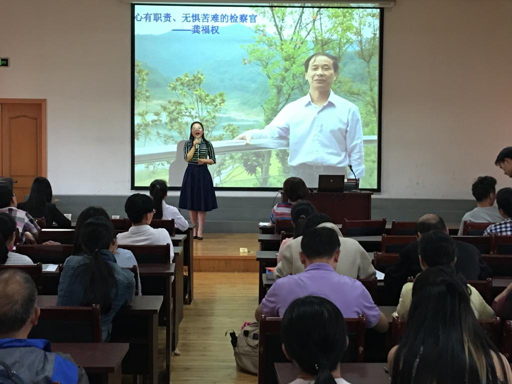 宣讲团成员为全体教师分别宣讲了有“绍兴的神探夏洛克”之称的绍兴市公安局刑侦支队一大队大队长周贤人;“心里想着职责,就不怕苦和难”的优秀检察官龚福权;“引领农村孩子成长的智者”的上虞市区崧厦镇金近小学校长何夏寿等三位道德模范的先进事迹。