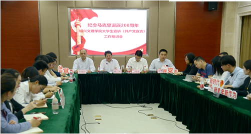 当天下午,纪念马克思诞辰200周年校大学生宣讲《共产党宣言》工作推进会在铁城科教馆一楼会议室举行。院长章越松及