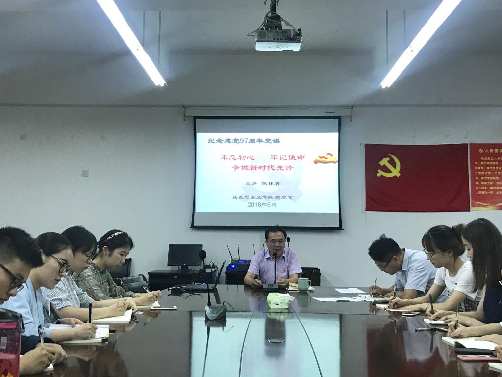 党课一开始,陈林刚书记回顾了四年中毕业生党员同志进入学院取得成绩和荣誉,并向他们致以诚挚的感谢。在建党97周年之际,陈书记围绕“不忘初心,牢记使命,争做新时代先锋”主题,从科学社会主义怎样诞生发展、中国共产党为什么要出发、中国共产党怎样一路走来、中国共产党如何继续前进这四个部分,带领全体党员重温了中国共产党成立97年来的光辉历史,弘扬红船精神,号召全体党员坚守中国共产党的初心和使命:为中国人民谋幸福,为中华民族谋复兴。最后,陈书记以老师和学长的身份,在大家即将毕业走向社会,正处在学校和社会的交叉点上之时送上四点寄语:一是坚守理想信念。始终坚守心中的理想信念,牢牢树立正确的世界观、人生观和价值观,是永葆党员先进性和纯洁性的必然要求,也是实现中华民族伟大复兴的必然支柱。二是强化党性修养。党性修养是每个共产党员一生的必修课。加强党性锻炼和党性修养,既是我们党的优良传统,也是新形势下加强党的建设的基础工程。要加强组织纪律和组织观念,积极主动参加党组织生活,进一步推进“两学一做”学习教育制度化常态化。三是练就过硬本领。修身养性、提升素质,虚心向书本学,向实践学,向同事学,努力提高认识和解决前进中出现的新情况、新问题的能力,努力精通本行业的业务知识,成为本职工作的骨干和行家里手。四是是励行知行合一。每一项事业都是靠脚踏实地、一点一滴干出来的。无论是学习还是工作,都要面向实际、深入实践、苦干实干,努力成为有理想、有学问、有才干的实干家,在新时代干出一番事业。