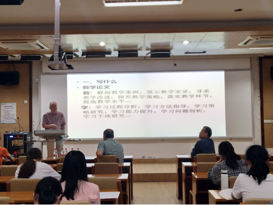 随后,董老师主要从“些什么”、“哪里来”两大角度来分享关于论文写作的经验和技巧。在“写什么”方面,董老师从一个普通教师的角度阐述了教学论文和科研论文两大块内容,为我们提供、开拓了论文选材的新视野。在“哪里来”方面,董老师表示可以从课程教材研究、教学实践反思、专业书刊阅读、学科课题研究四个方面着手。除此之外,董老师还为我们指明了撰写论文的可选路径:带着理论——深入实践——总结提升。