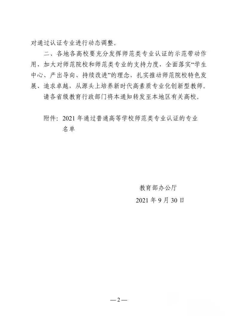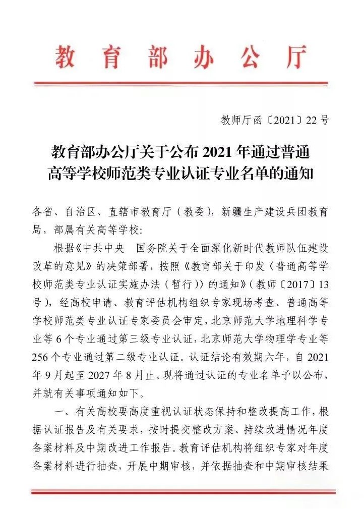 日前,教育部办公厅发布了《关于公布2021年通过普通高等学校师范类专业认证专业名单的通知》(教师厅函〔2021〕22号),伟德官网思想政治教育、数学与应用数学专业顺利通过师范类专业第二级认证,认证结论有效期六年(2021年9月至2027年8月)。根据教育部《普通高等学校师范类专业认证实施办法(暂行)》的规定,通过二级认证的专业在认证结论有效期内入学的师范生,可由高校自行组织中小学教师资格考试面试工作。