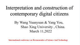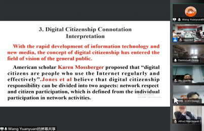 在这次会议期间,王媛媛做了题为《当代数字公民诠释与建构》(《Interpretation and construction of contemporary digital citizens》)的全英文主题报告。报告指出,随着第四次工业革命的推进,人类社会正处于从工业化时代向数字化智能化时代转型的关键时期,这一体系性的转变意味着人类生产方式、经济结构、组织方式、社会形态和生活方式的系统性变革。数字时代塑造并诠释数字公民。公民应具有自主性、自为性、选择性和主体性。数字公民意味着能够安全地、合法地、符合道德规范地使用数字化信息和工具。在(后)数字时代,数字公民建构应从如下四个方面着手:建构新媒介环境下的政治认同意识,建构后真相时代下的科学思辨精神,建构信息网络空间下的法治意识,建构数字社区下的公共参与情怀。