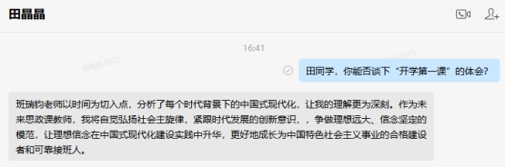 “阿瓦提县纺织产业园的建设,鲁迅幼儿园、小学、中学的设立,阿克苏地区的柯柯牙绿化工程落地,都展示了绍兴在经济、教育和生态等方面对新疆的支援”。王明亮老师在课堂上描述了援疆支教工作的经历,他以对口支援这一中国特色的扶贫方式解读以中国式现代化全面推进中华民族伟大复兴。