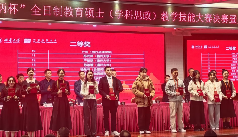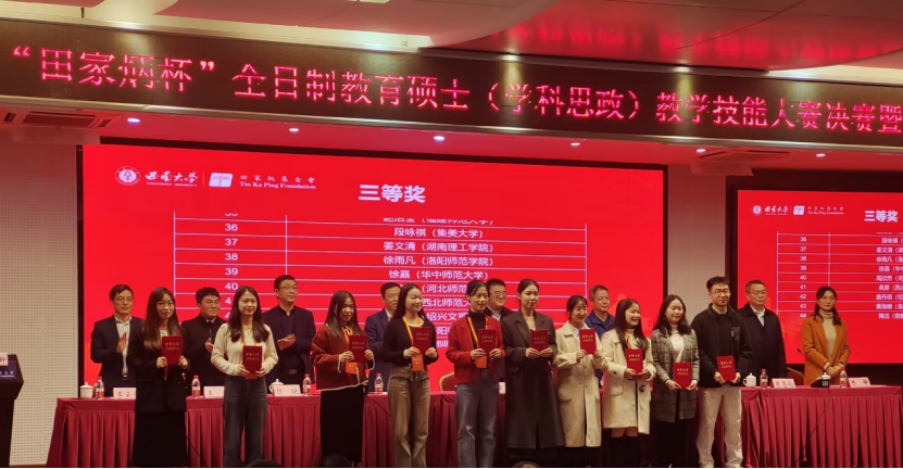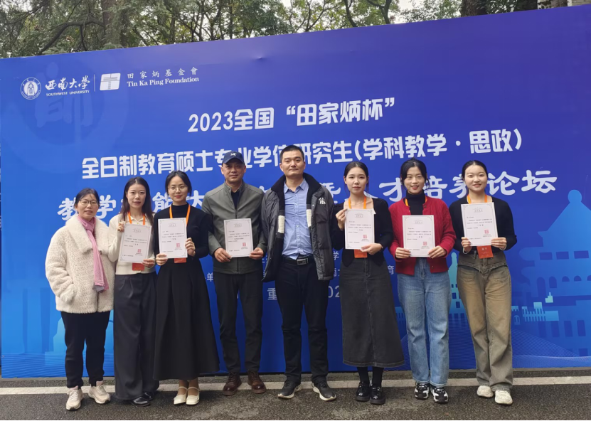 2023年全国“田家炳杯”全日制教育硕士专业学位研究生(学科教学·思政)教学技能大赛决赛于2023年12月1-3日在西南大学成功举办。伟德官网学子勇创佳绩:2021级硕士研究生朱晓静、2022级硕士研究生许苗获得二等奖;2021级硕士研究生唐丹琪、2022级硕士研究生韩婷瑜、2022级硕士研究生鲍沁羽获得三等奖,章越松教授被授予“优秀指导教师奖”。5名学子全部获得三等奖以上的奖项,满载而归。