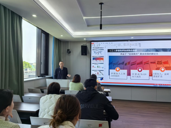 课程教研组组长宓才裕围绕“备编讲研”四个方面,对本学期选定的“当前国际形势与中国的原则立场”“读懂中国式现代化与中华民族共同体意识”“经济高质量发展与就业政策”等教学模块内容进行深入浅出的解读和辅导,同时针对性地提出了教学建议。