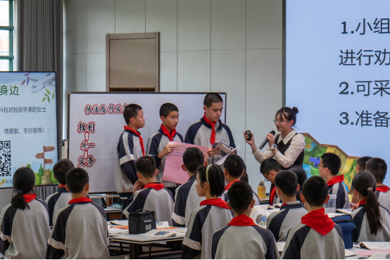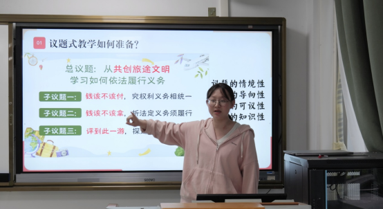 活动现场,庞康达老师带来高质量课例《法律保障生活》,他以预防校园欺凌为主线,精心设置环环相扣、层层递进的三个子议题,带领学生探究法律特征及作用,希望同学们能够在日常生活中运用法律指引自己的行为,共创和谐社会!王玉瑶为我们带来《依法履行义务》的展示课,她以旅途中的经济纠纷为情境,通过议学任务来引导学生们深入理解权利与义务的关系,并鼓励大家争做依法履行义务的小卫士!两位老师的课堂精彩生动,学生们的积极性被充分调动,彰显了议题式教学的独特魅力,也让大家领略到一场酣畅淋漓的“普法课”。随后,韩英老师肯定两堂课亮点纷呈,并结合两个课例细致分析了议题式教学的样态:以递进式的议题为引线,以贴合学生生活的情境为载体,以议学活动为依托,以落实知识点为中心,以核心素养培育为目标,以学生学情为基本遵循。韩老师的点评恰如其分,讲解深入浅出,为《模拟教研室》课程组厘清了议题式教学的方向。