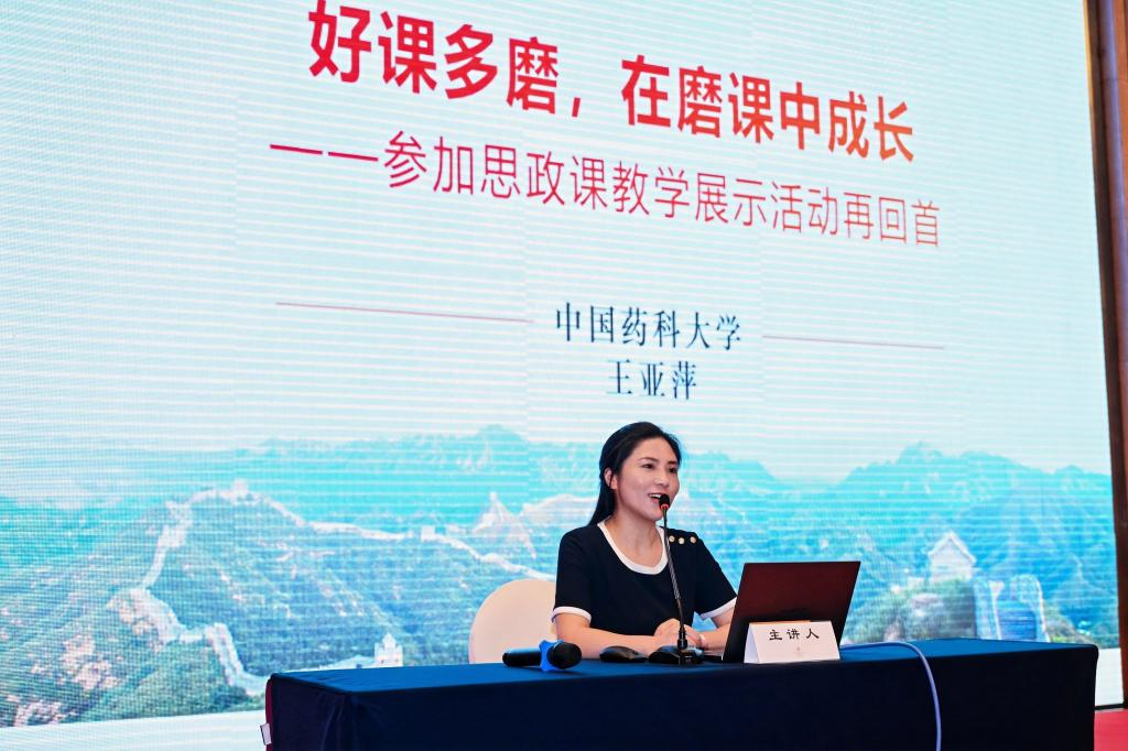 第三届教育部思政课教学展示特等奖获得者、中国药科大学王亚萍副教授作主题为《好课多磨,在磨课中成长》的报告,从“谁来磨”“磨什么”“怎么磨”三个方面,分享了教学团队的组建、教学设计的打磨,以及致力于“经师”与“人师”相统一的自我成长。