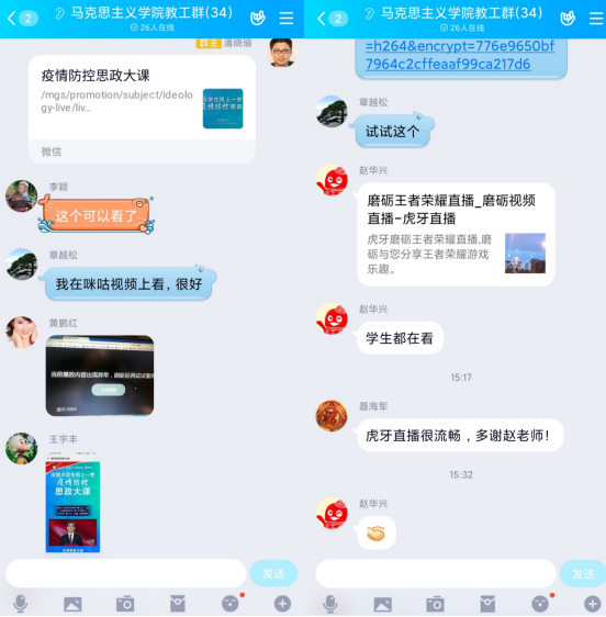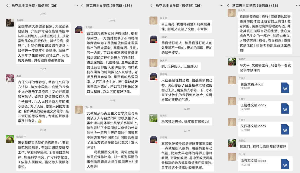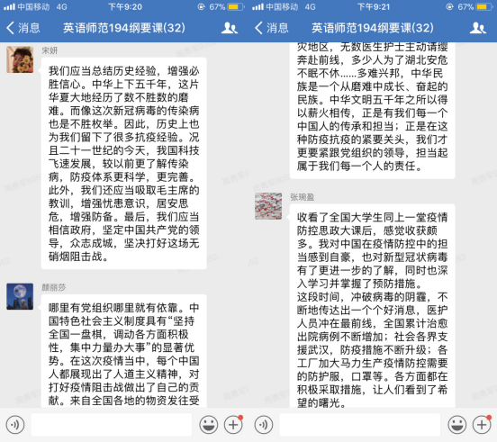 期间,同学们在班级群内积极参与在线讨论,畅谈观后感,抒发肺腑之言。学生们纷纷表示,在线直播思政课的形式新颖,也符合疫情期间的实际需要,跟思政教师、辅导员和同学们互动也比平时在课堂上更放松,感触更深,收获更多。