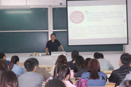 《形势与政策》课教研室副主任任国栋从朝鲜半岛局势与前景、南海问题、中印边境争端、中美关系跌宕起伏、混乱的中东局势、德国组阁完成等方面讲解了当前国际局势。