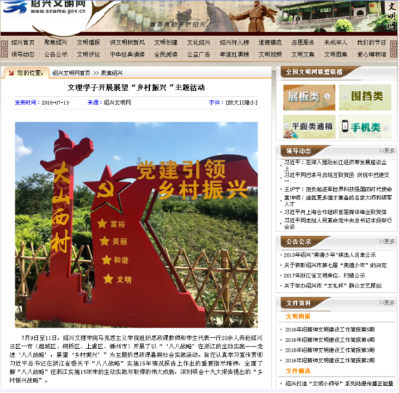 四是“社会实践”品牌化。组织学生深入乡镇、企业开展社会实践活动。今年学院组织2个小分队开展暑期“三下乡”社会实践活动,浙江“八八战略”调研团获评校2018年暑期社会实践校级重点团队,活动被浙江新闻、绍兴网、绍兴文明网、绍兴青年等主流媒体报道。