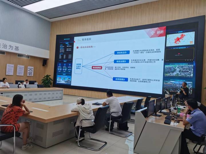 为了对新时代“枫桥经验”的基层智治实践有更全面的感知,7月4日中午,“基层治理”实践团来到枫桥镇社会治理中心。“欢迎同学们来到社会治理中心,现在的基层治理正在朝功能高效、智慧集成、多元共治的方向推进。”社会治理中心蔡教导员告诉到访的师生。