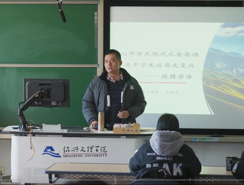 “阿瓦提县纺织产业园的建设,鲁迅幼儿园、小学、中学的设立,阿克苏地区的柯柯牙绿化工程落地,都展示了绍兴在经济、教育和生态等方面对新疆的支援”。王明亮老师结合自己援疆支教工作的经历,以“对口支援”这一中国特色的扶贫方式生动解读了“以中国式现代化全面推进中华民族伟大复兴”这一主题。