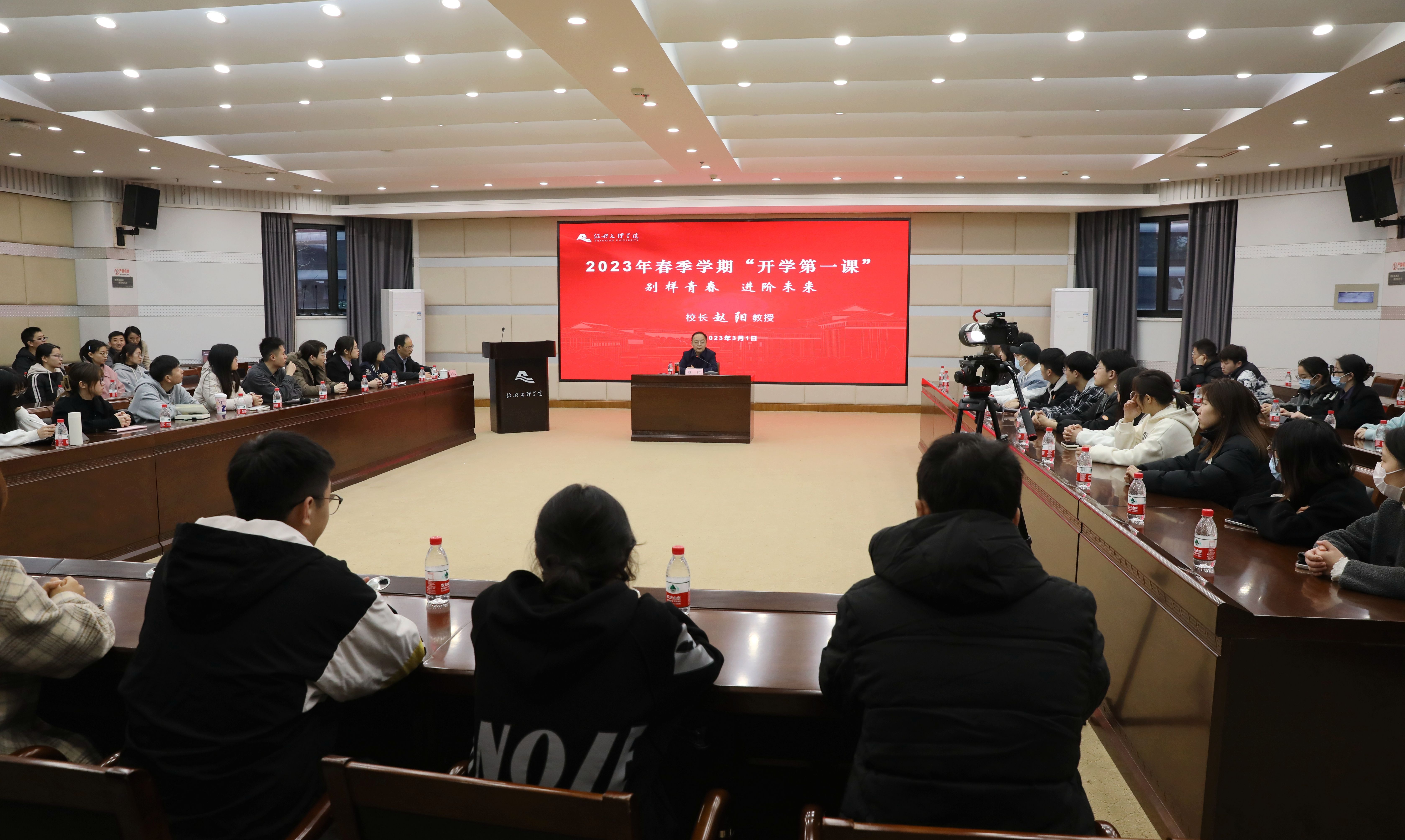 “同学们的如约返校,让寂静冷清的校园重新焕发出生机和活力,有你们真好”,校长赵阳深情饱满的讲授“开学第一课”。他回顾了三年来,以习近平同志为核心的党中央团结带领中华儿女抗击疫情、战胜疫情的伟大实践和成就,分析了中国经济社会发展长期向好的大势,阐释了中国式现代化道路的核心要义,叮嘱同学们牢记习近平总书记的殷殷嘱托,胸怀山河、挺膺担当,希望同学们“坚定理想信念,厚植爱国爱校情怀” “勇毅笃行,惟实创变” “眼里有光芒,心中有诗意”,不断锤炼品德修为、练就过硬本领,以奋斗之姿展现别样青春。