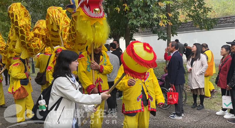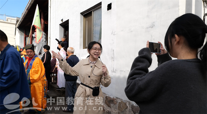 舜王巡会中,该校大学生吴越文化研究会的宣讲员冯煊茹和巡会队伍里的阿姨聊得火热。“在过去的调研中,我们发现本地信众虽然每年都参与舜王庙会,但对其扮演的角色和庙会的目的却并不了解,因此,我们专程来对巡会队伍进行访谈、培训和宣讲。”冯煊茹介绍道。