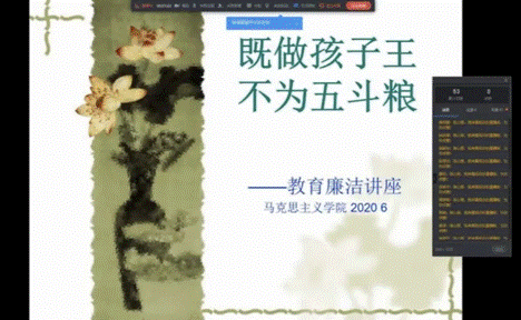 2020年6月4日晚七点,马院大一至大三的全体同学在线上参与了主题为“既做孩子王,不为五斗粮”的教育廉洁讲座,主讲人为本院的许大平老师。