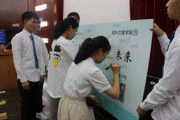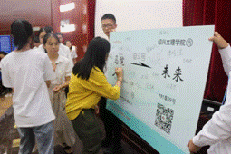 全体新生及班主任李颖副教授在马院开往未来的“奋斗号”车票上签字合影,2019级新生翻开崭新的篇章。