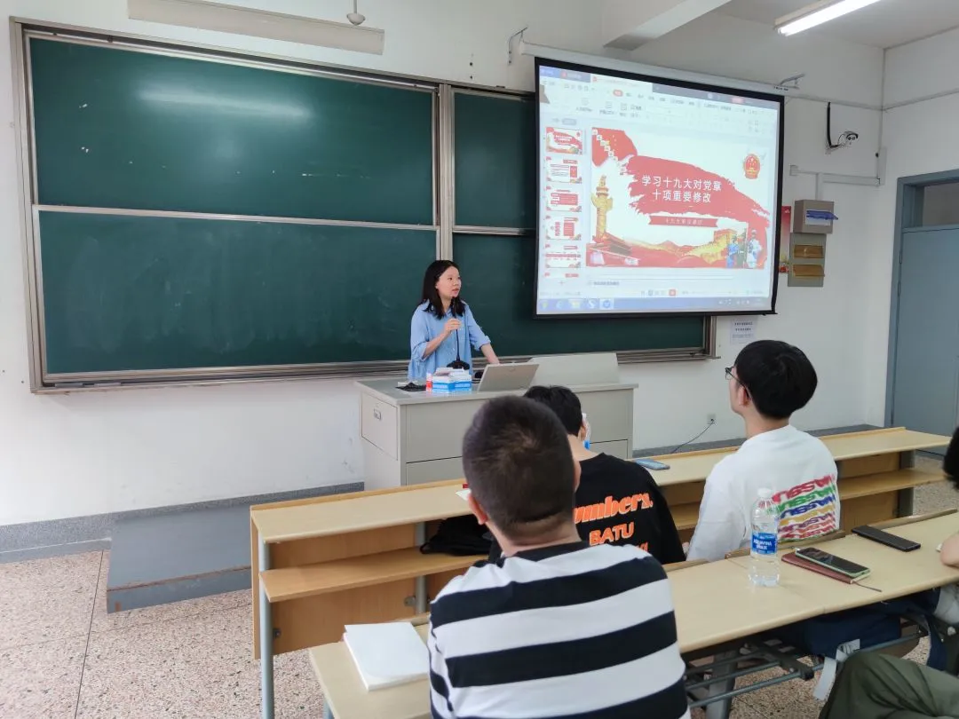 随后发言的是肖海岳书记。肖书记主要介绍了十九大中对党章的十项重要修改,包括习近平新时代中国特色社会主义思想、实现中华民族伟大复兴的中国梦、供给侧结构性改革和“绿水青山就是金山银山”等写入中国共产党章程。此外,她还强调学风的重要性,希望我们能够在理论积累和价值观沉淀下,努力成为一名合格的共产党员。