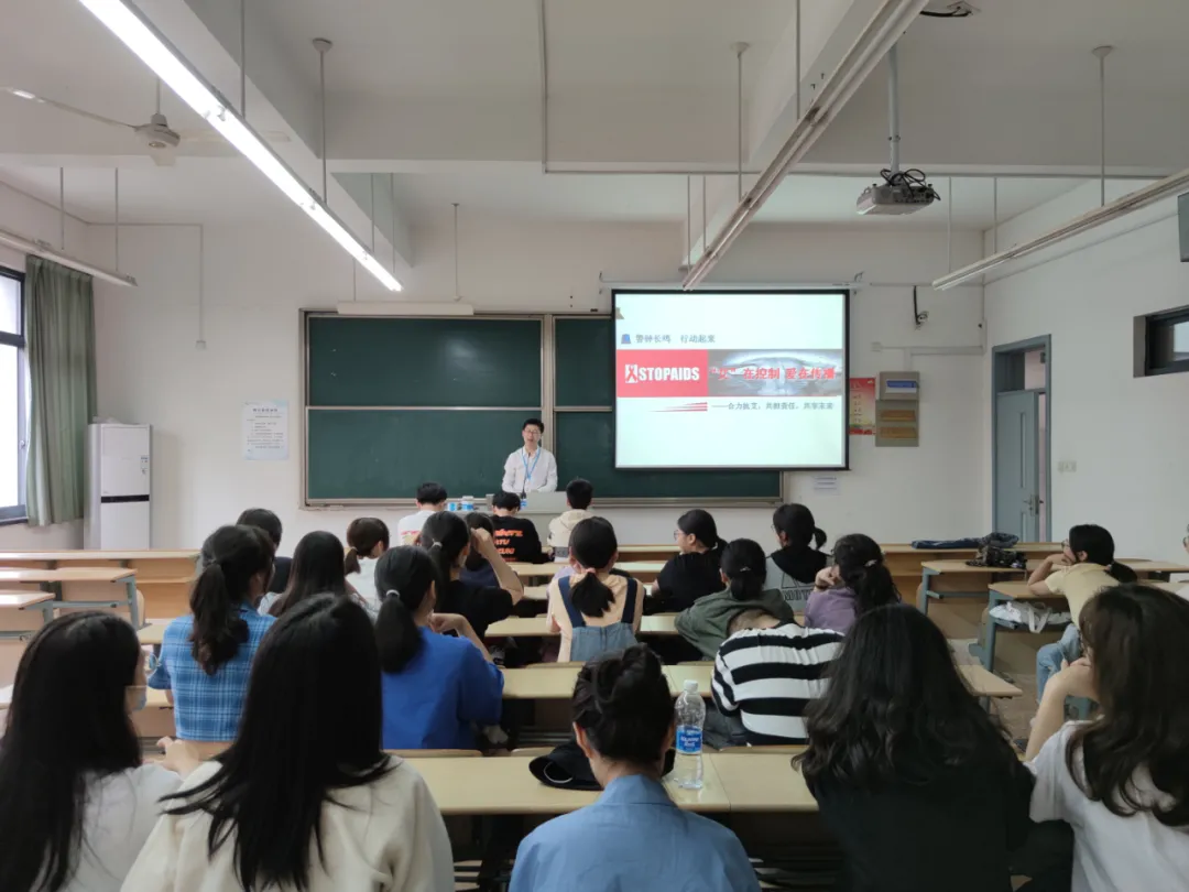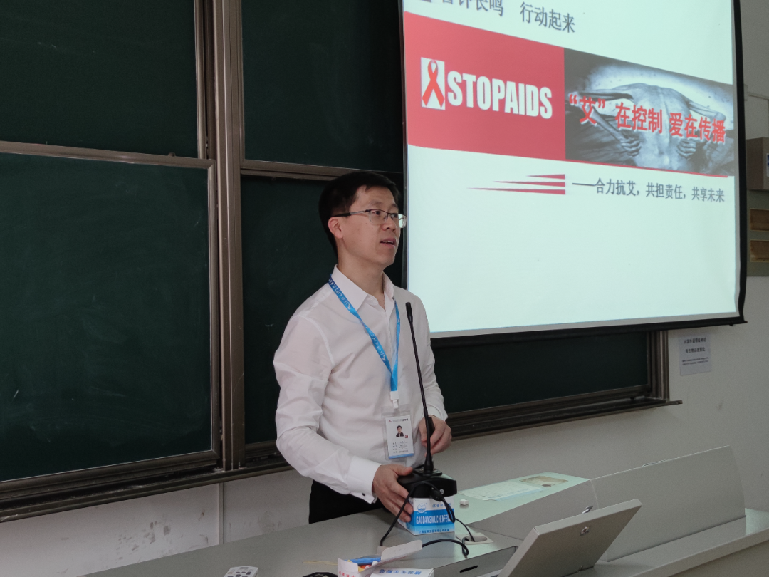 马国庆老师就艾滋病的主要相关知识为同学们进行普及。为同学们讲解了艾滋病的含义、临床表现和传播途径以及如何确诊艾滋病等问题。他告诉同学们,目前艾滋病防控形势依然严峻,希望同学们能洁身自爱,培养预防艾滋病的社会责任感,不歧视艾滋病人,做到遏制艾滋,从自身做起。