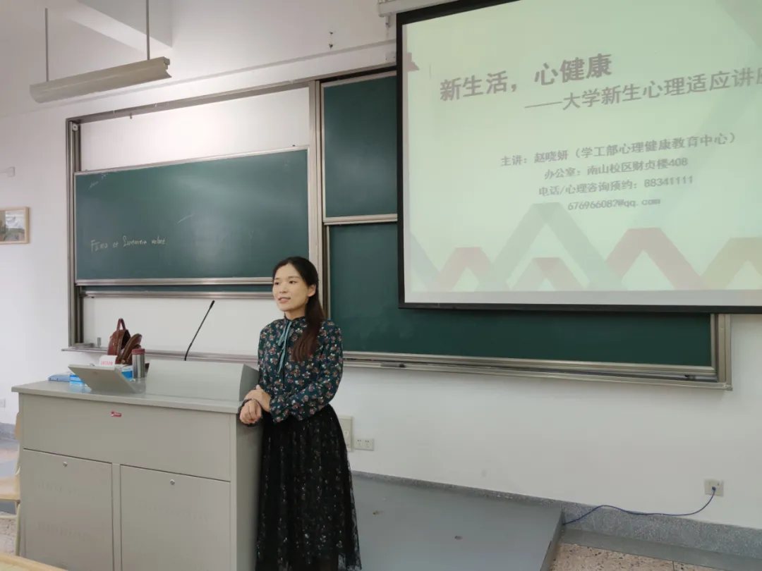 赵老师首先通过视频,结合学长学姐的经验告诉同学们大学和高中的区别主要体现在自我管理、学习节奏和人际关系等方面。其次,通过三个案例提醒同学们要及时调整好心态,“不仅是选你所爱,更是爱你所选。”随后,赵老师通过图表的形式直观地向同学们展示了大学时光在人生中的重要地位,希望同学们能有长期且明确的目标。最后,向同学们介绍了伟德官网“心灵港湾”——学工部心理健康教育中心的时间、流程等相关情况。