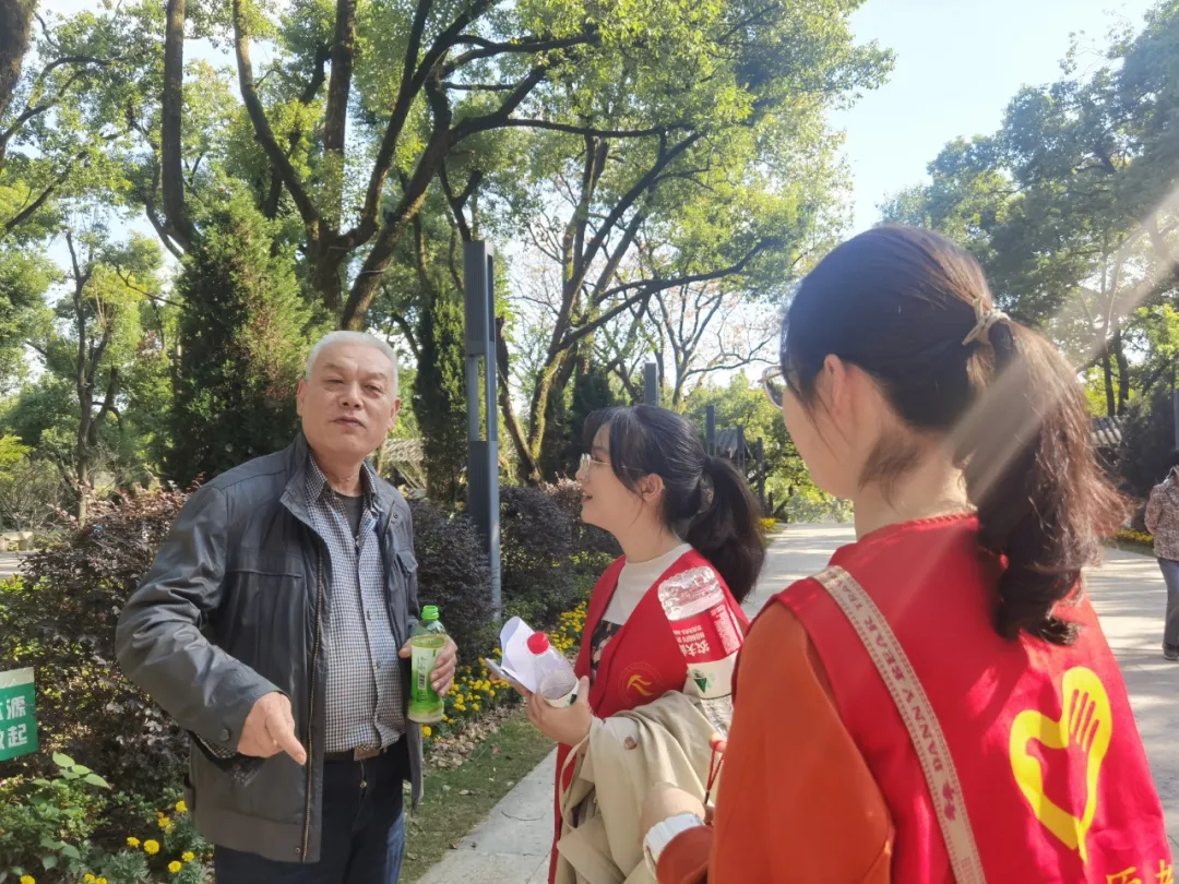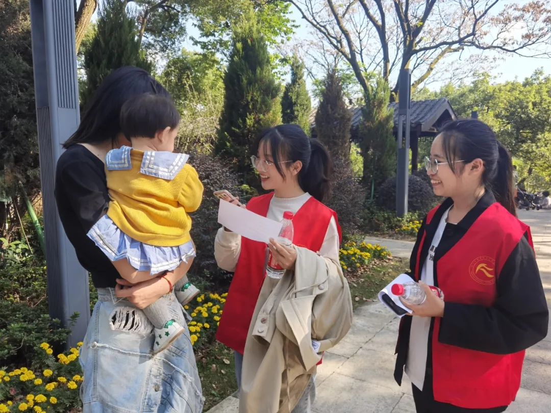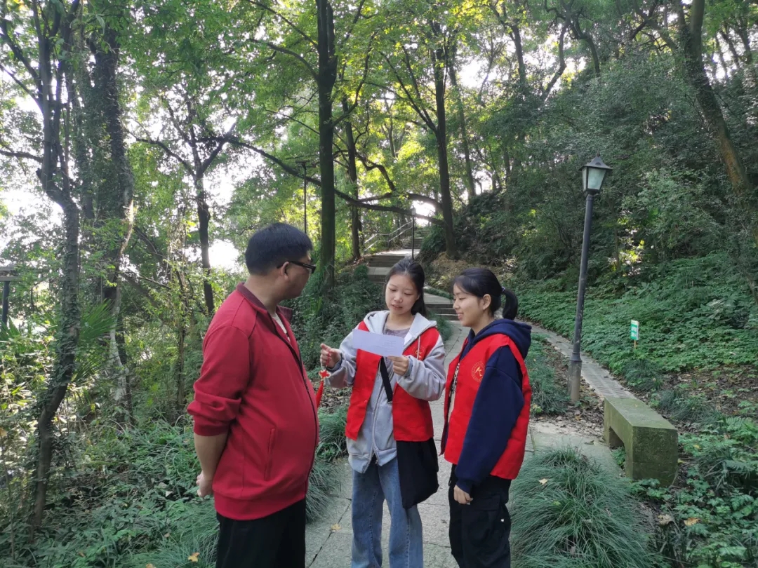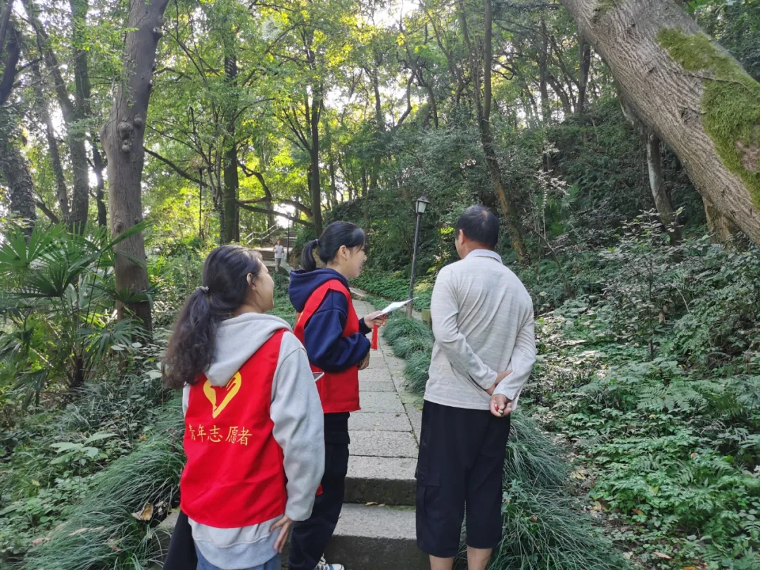 秋高气爽,府山公园内迎来了众多享悠闲时光、赏自然美景的游客,志愿者们也身穿红马甲,发放宣传单并随机向游客们提问,宣传越文化,并把中国结作为小礼物送给游客。志愿者们积极热情,游客们也对此表现出了浓厚的兴趣,有侃侃而谈的,有虚心求教的,都对我们的古越文化有了更为深刻的认知。