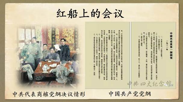 下午六时许,伴随着“共产党万岁,第三国际万岁,共产主义、人类的解放者万岁。”口号,具有划时代意义的中国共产党“一大”,就这样结束了。那艘在波涛中轻轻摇晃的画舫,成了中国共产党诞生的摇篮。