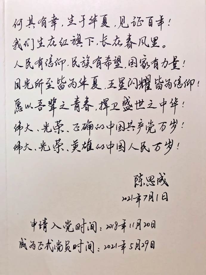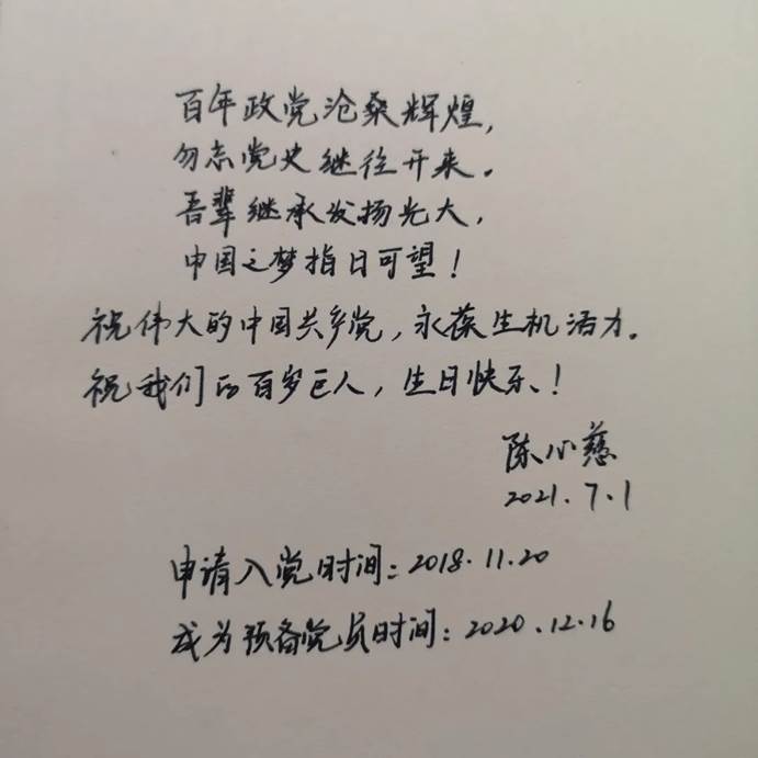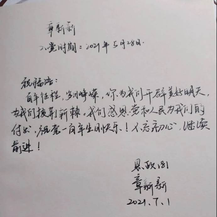 学生党支部开展了“忆初心、送祝福”党日活动。全体党员在党员纪念笔记扉页上写上了入党日期,并送上了中国共产党成立100周年的真切祝福。