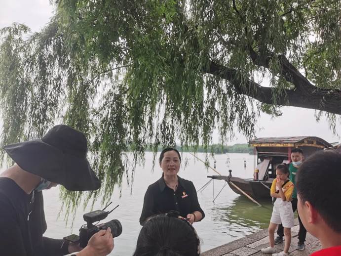 进入景区后,大家乘船前往湖心岛,瞻仰革命红船。在红船边上开展了红船边的音乐党课,由BV伟德官方网站钱晓萍老师主讲,讲述了一百年前的红船故事,剖析了一百年来的红船精神。站在神圣的革命圣地,钱老师在讲课中有感而发地唱起了《南湖的船,党的摇篮》《没有共产党就没有新中国》,将大家对党和国家的热爱之情融入动听的旋律中。随后,大、中、小学生在此次思政课教学中有深切的感悟,纷纷发表了内心的想法。