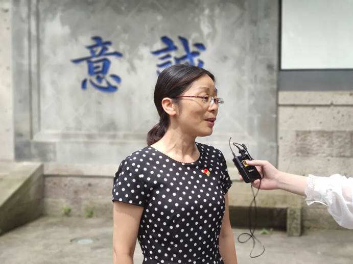 接下来进行的是“大小一家亲,携手送祝福”红色快闪活动。同学们完成党的拼图,教师、学生手挥小国旗分别从四角走中心,歌唱歌曲《没有共产党就没有新中国》,喊出活动主题口号“请党放心,强国有我”。在活动进入尾声之际, “绘”芳华绍兴台门宣讲团队指导老师俞雅芳、团队成员王姝人与王佳熠也谈了谈她们的感悟。王佳熠同学表示,未来属于青年,希望寄予青年。作为新时代的中国青年,我们要以实现中华民族伟大复兴为己任,增强做中国人的志气、骨气、底气,不负时代,不负韶华,不负党和人民的殷切期望。