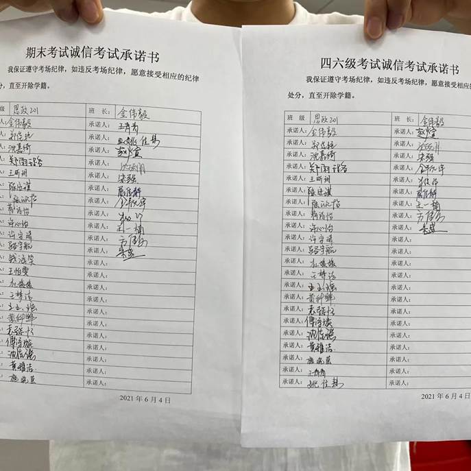 心中有戒,做人清白。思政201团支部开展了“立足诚信,杜绝作弊”诚信考试承诺书的签订活动。在班长金伟毅的带领下,支部同学有序地签署了期末考试诚信考试承诺书和四六级考试诚信考试承诺书。