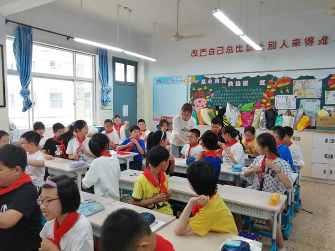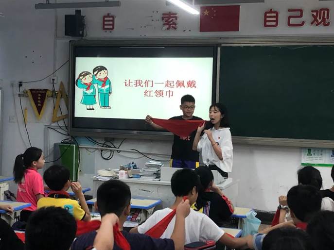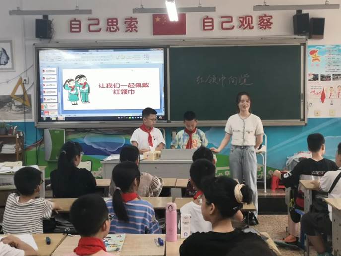 “同学们,请问你们是否了解红领巾的前世今生?”毕业生党员、思想政治教育(师范)171班的胡晶晶在参加完毕业典礼后,站在鲁迅小学5年级(2)班的讲台上为少先队员们带去了生动的党史小故事,通过现场系红领巾比赛、峥嵘岁月情境演绎、知识竞答、集体朗诵、齐唱队歌等创新设计,让他们对天天相伴于胸前的红领巾有了更深的感情,同时也树立了少先队员们“从小听党话,永远跟党走”的决心与信念!