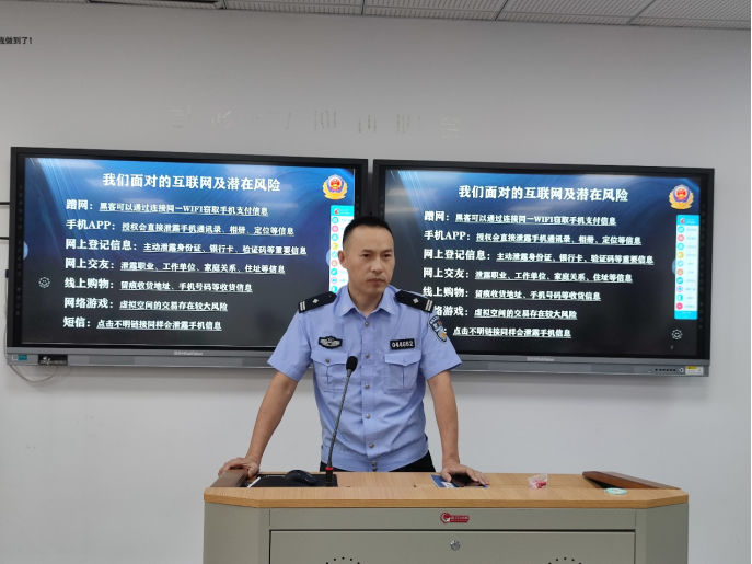 主讲人给大一大二学生介绍了网络贷款诈骗、刷单返利诈骗、“杀猪盘”诈骗、冒充电商物流客服诈骗、冒充熟人或领导诈骗、虚假购物诈骗、网络游戏虚假交易诈骗等多种诈骗方式。