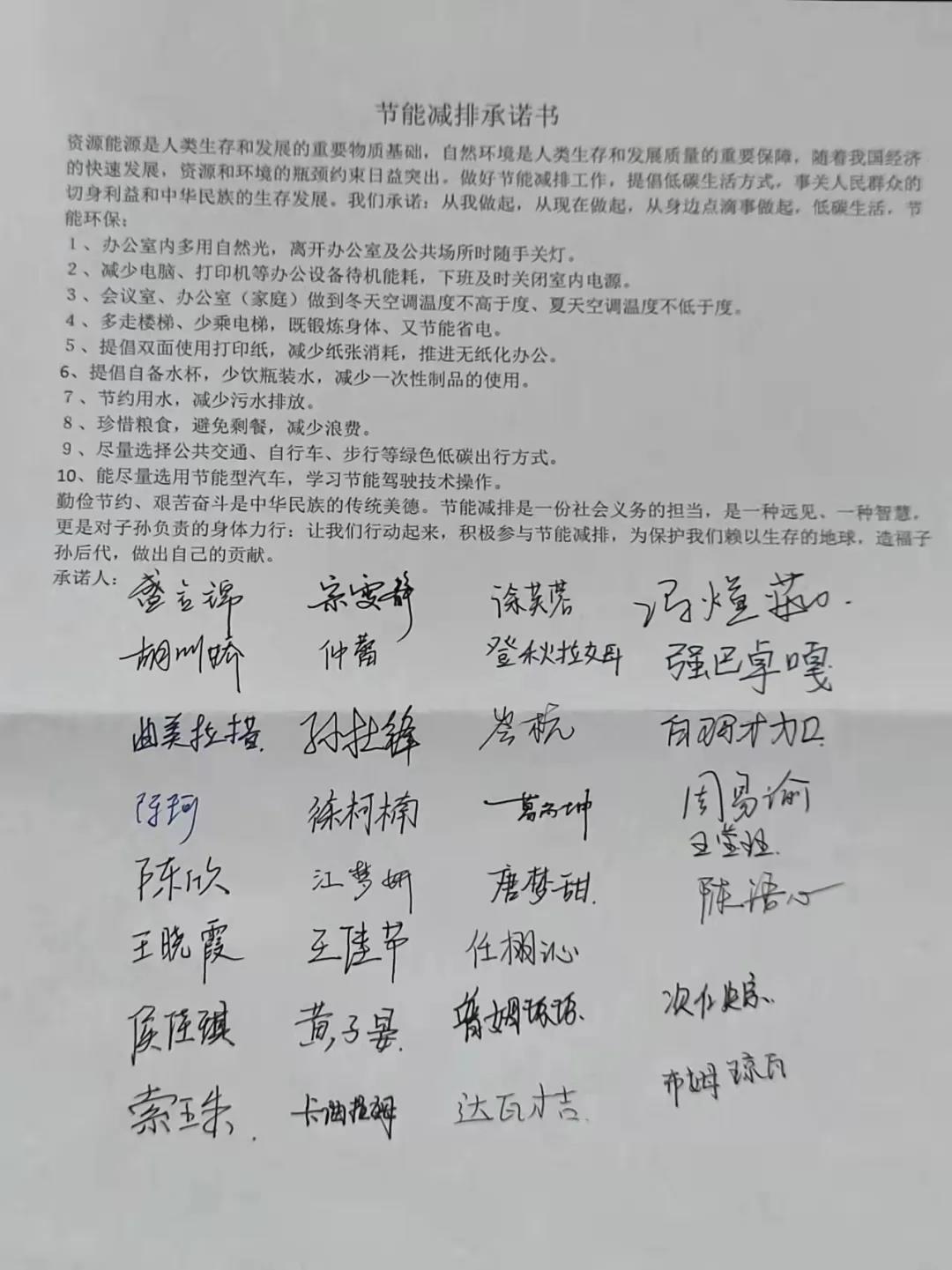 最后是“节能从我做起”的承诺书签名活动,每名支部成员都能毫不犹豫地在承诺书上签上自己的姓名,承诺自己会从生活中每一件小事做起,如控制空调温度、抓好节水管理、及时关闭电源等,促进绿色校园建造,践行自己的社会责任。