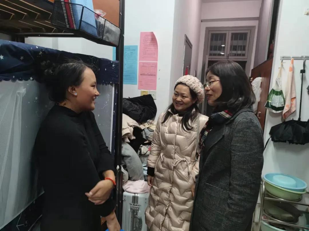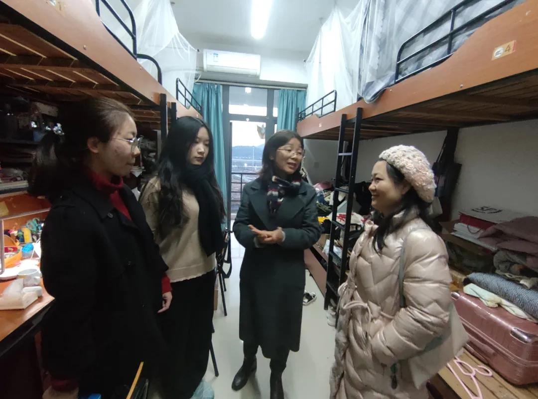 在走访贫困生寝室时,陈红老师和俞雅芳老师询问他们生活近况。同时对远道而来的藏族学生给予关怀,了解当地习俗并且强调学院老师永远站在身后。在询问生活之余还关心了学业问题,提醒关注紧接下来的期末考,让同学们好好学习迎接期末大考。