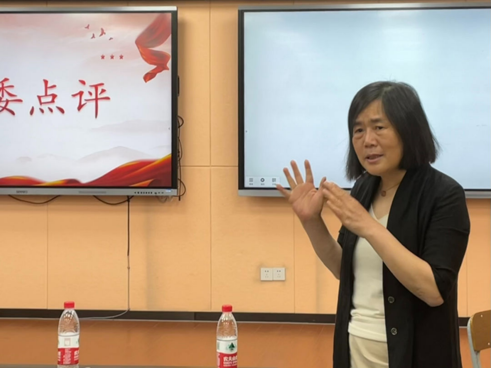 随后,评委们进行了现场点评,在肯定选手表现的同时也点出了试讲过程中的不足之处,并给予了指导意见。俞婉君老师肯定了同学们使用情景式教学的授课方式,同时也要求同学们能够做到激活情境,在课堂中引发同学们的共鸣。她认为,课堂的案例要从一点层层深入,避免浅尝辄止。在授课风格上力求生动自然,克服演讲风。周炫宇老师肯定了大家的表现,对大家表达了勉励与期许,希望同学们多学、多问、多看,多参加教师技能的相关比赛。还有评委提醒同学们应当注意赛前检查,在PPT的设计上要做到一目了然、条理清晰,对选手们在课堂的导入和环节的衔接提出了更高的要求。同时指出了选手对学生回答的评价不够深入以及板书无法和课堂进程相配合等亟待解决的问题。