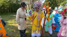 记者顺着姚铮的提示,找到了BV伟德官方网站大学生吴越文化研究会的宣讲员冯煊茹,她正和巡会队伍里的阿姨聊得火热。“不是普通的聊天,其实是我想通过轻松的聊天氛围,引导她谈一谈对舜的信仰。”冯煊茹这样告诉记者。她和巡会队伍从绍兴王坛镇三桥头出发,途经肇湖,正朝着舜王庙不断前行,其间可以看到拿着“小蜜蜂”的大学生穿梭其中。“在过去的调研中我们发现,本地信众虽然每年都会参与舜王庙会,但对其扮演的角色本身、对庙会的目的却没什么了解,因此,我们社团12位成员分成四个宣讲组和一个拍摄组,专程在这天对巡会队伍进行访谈、培训和宣讲。”冯煊茹介绍道。在访谈中,大学生们提前准备访谈提纲,以“受访者的自我介绍、队伍名称、参加巡会的次数、心目中的舜王形象”等问题为核心,了解每个巡会队伍的具体情况,通过拍摄视频的方式记录受访者的口述内容。在宣讲中,大学生们以谈话交流的方式与巡会队伍进行互动,在仔细研读国遗丛书《绍兴舜王庙会》的基础上,向每一支巡会队伍介绍该队伍在舜王巡会扮演怎样的角色、队伍的妆造及服化道、舜王庙会的价值等内容,普及相关知识。在培训中,大学生们在巡会队伍中手把手进行演示,指导巡会队伍的表演形式、动作等,其中包括帝王出巡开路先锋队的开拓前行,仪仗队的威武神气,民众扮演人界、动物界、仙界的欢庆场面。