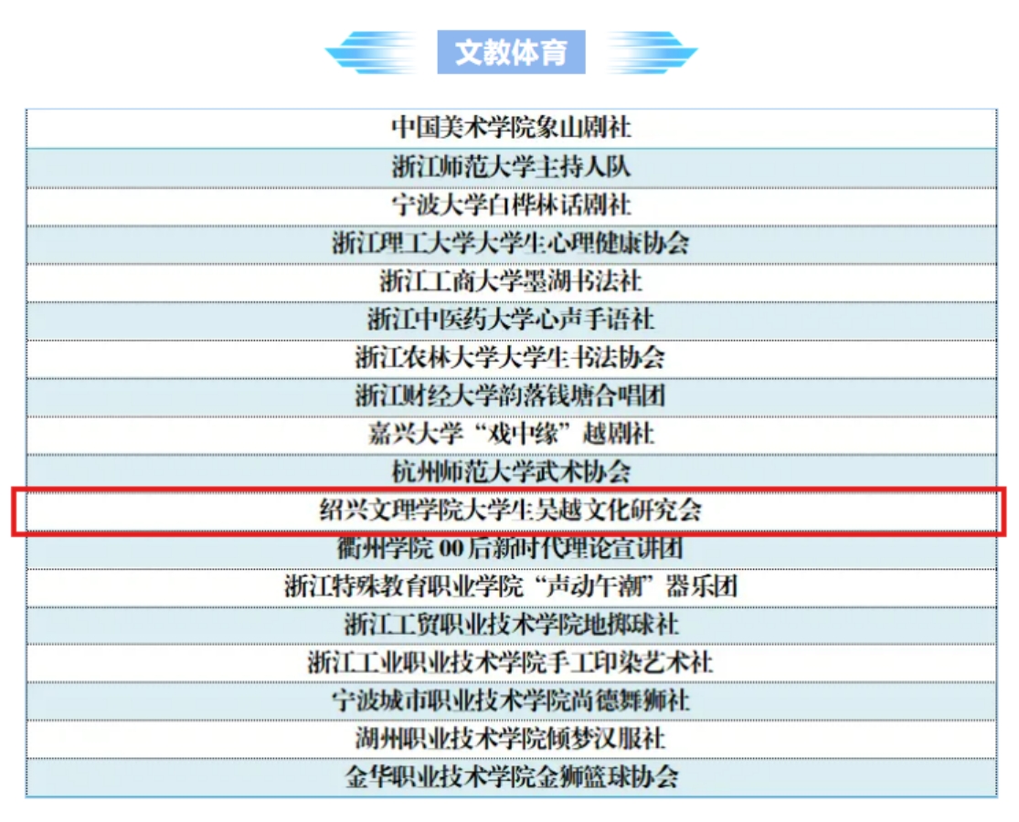 为进一步激发高校学生社团活力,充分发挥学生社团育人功能,在团浙江省委学校部、浙江省学联开展的省级“活力社团”风采展示活动中,伟德官网大学生吴越文化研究会荣获2023-2024学年高校“活力社团”风采展示“文教体育”板块优秀社团!