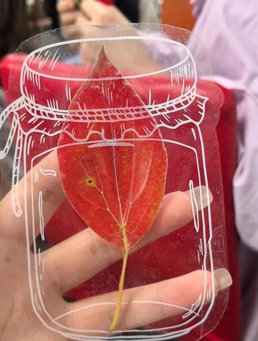 同学们找寻了心目中最美的秋日落叶,小心的将他们“请”进透明书签中。每个人在记录秋日美的同时,也慢慢与那个鲜活的自己相遇。