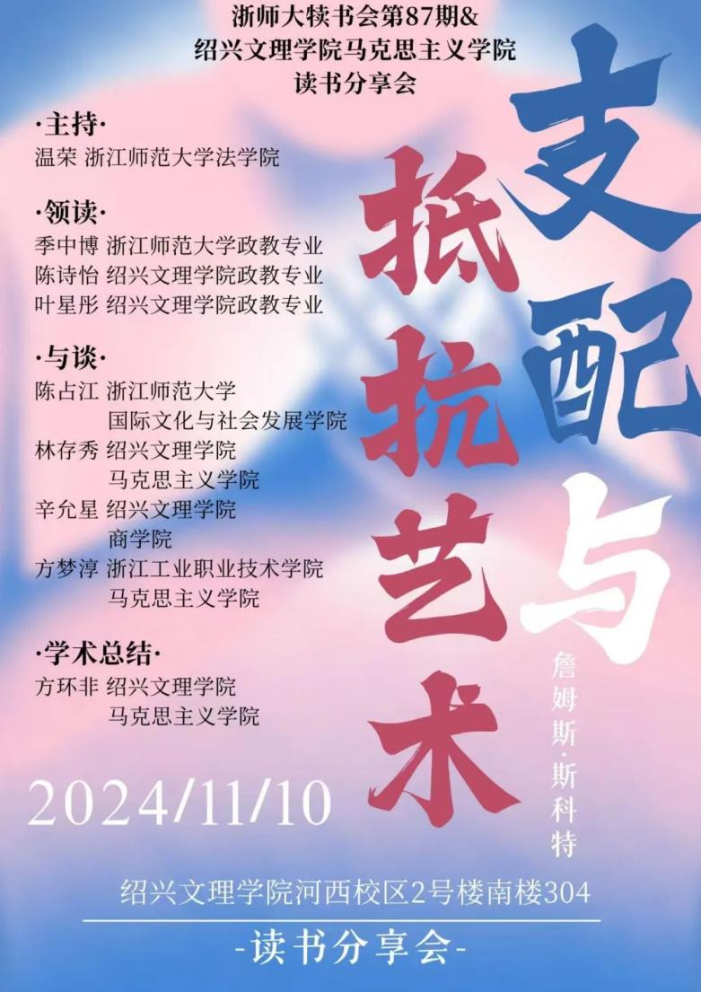 为进一步促进思想的交流,加强两校思政专业学生深入理解现代社会中法政层面的支配与抵抗关系。通过共读、讨论,培养批判性思维,增强分析问题能力,拓宽学生思路,提升对思政专业相关复杂社会现象的认知水平。BV伟德官方网站BV伟德官方网站将与浙江师范大学思政专业师生举办共读一本书活动,阅读书目为《支配与抵抗的艺术》。