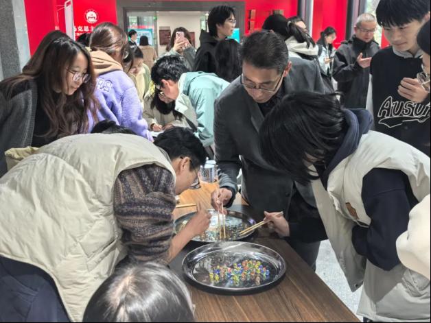 比赛区域的桌子上,摆放着一个个装满弹珠的透明玻璃碗,旁边是细长的筷子和空碗,在灯光的映照下,弹珠闪烁着五彩的光芒。一声令下,参赛师生迅速拿起筷子,伸向玻璃碗中的弹珠。大家在这场简单而有趣的夹弹珠比赛中收获了欢笑和友谊。