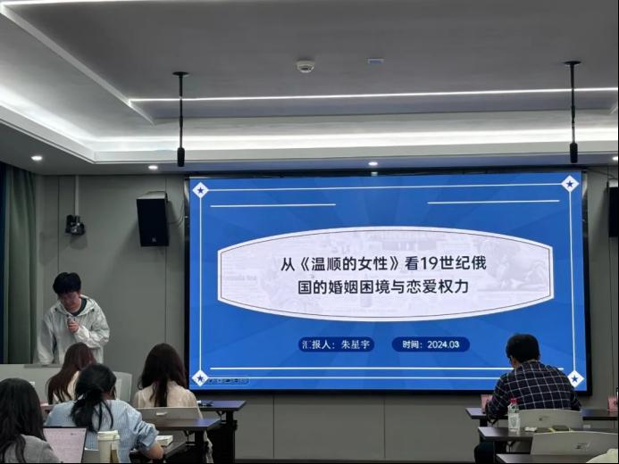 朱星宇同学则以《温顺的女性》为切口,深入探讨 19 世纪俄国的婚姻困境与恋爱权力。他从时代背景、核心主题、人物关系到现实对照,层层剖析,独特的见解令同学们耳目一新,仿佛穿越时空,置身于那个充满矛盾与挣扎的俄国社会。