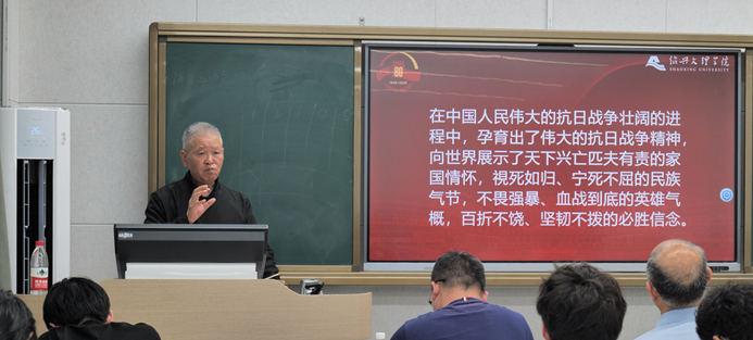 在解读抗战精神内涵时,王老师援引习近平总书记在抗战胜利75周年座谈会上的重要讲话,强调抗战精神凝聚着家国情怀、民族气节、英雄气概和必胜信念,并以国共合作建立抗日民族统一战线,全民族同仇敌忾抵御外侮为例,论述抗日战争是全民族浴血奋战的伟大壮举。他以“爱国主义是支撑国家的大厦”的铿锵话语,呼吁同学们要将爱国主义像钢钉一样牢牢扎在心里。