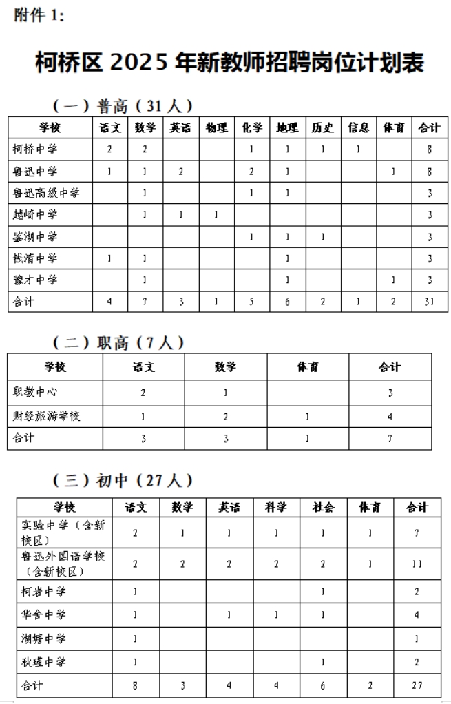 本次计划招聘教师114名。招聘岗位详见《柯桥区2025年新教师招聘岗位计划表》(附件1)。